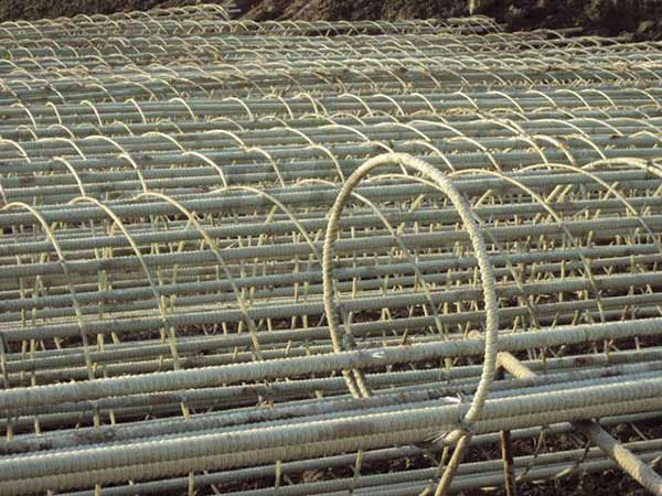 3、由于玻璃纖維樹脂筋材在生產(chǎn)時采用的是熱固性樹脂制作,成形之后在施工現(xiàn)場很難改變其形狀,為了保證玻璃纖維鋼筋籠的順利下放,可以利用10#(3.5㎜)鍍鋅鐵線將籠底的玻璃纖維主筋綁扎,起到收口的效果。